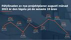 Enligt Byggfaktas Byggstartsbarometer byggstartades kontorsprojekt för drygt 14,9 miljarder kronor under perioden september 2021 till augusti 2022, att jämföra med 15,6 miljarder kronor under föregående period.